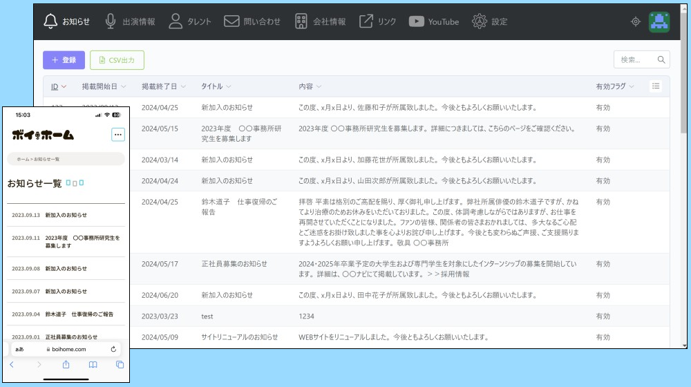 ボイホームは声優業界の業務に合わせて機能を最適化したスホームページ管理システムです。