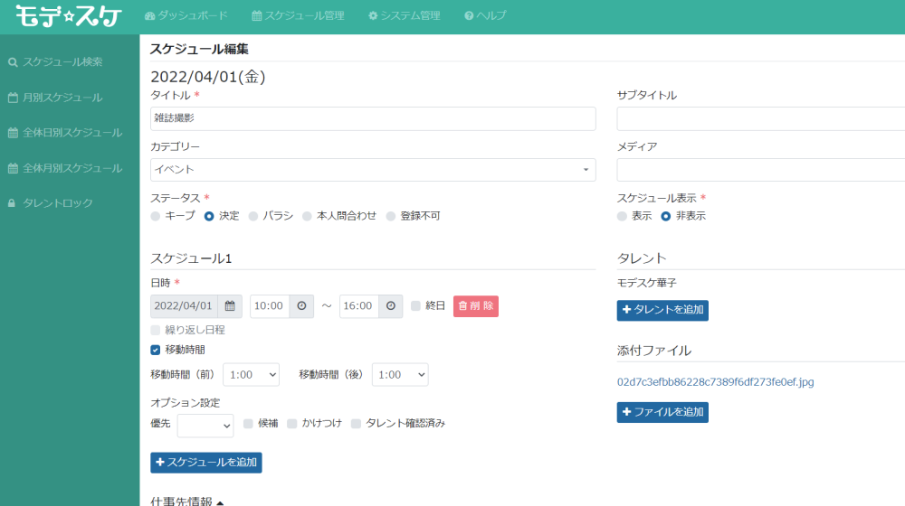 登録されたスケジュールはエクセル形式で出力することが可能です。また、案件の注意事項や資料などの情報ファイルをスケジュールに添付し、社内やタレントと共有することができます。